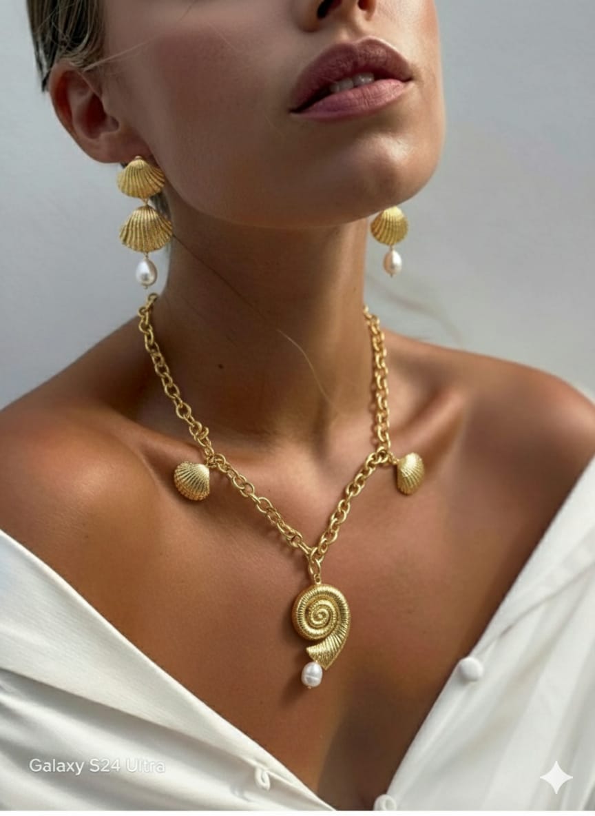 Ces ravissantes boucles d’oreilles plaquées or sont un hommage à la mer. Elles comportent deux délicats coquillages striés, empilés l’un sur l’autre, d’où pend une élégante perle d’eau douce. Leur design est à la fois sophistiqué et intemporel, évoquant le charme de l’océan.