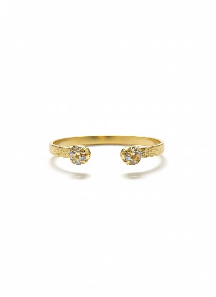 ​Ce bracelet manchette ouvert et élégant est plaqué or et présente une finition délicatement texturée qui capture la lumière. Chaque extrémité est ornée d’une superbe pierre gemme scintillante, disponible dans une variété de couleurs éclatantes