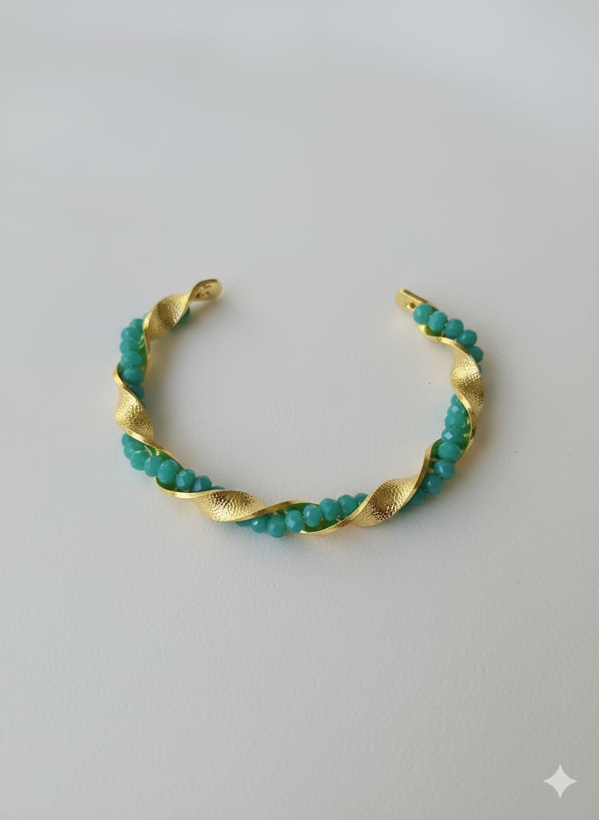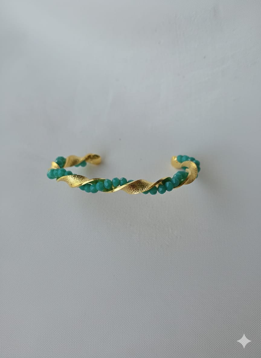 Cet élégant bracelet jonc (ouvert), plaqué or, présente un envoûtant motif de torsade texturée. Une délicate rangée de perles fines lumineuses est nichée avec soin entre les deux bandes du métal doré. Sa conception ouverte permet de l’ajuster facilement et de le porter confortablement